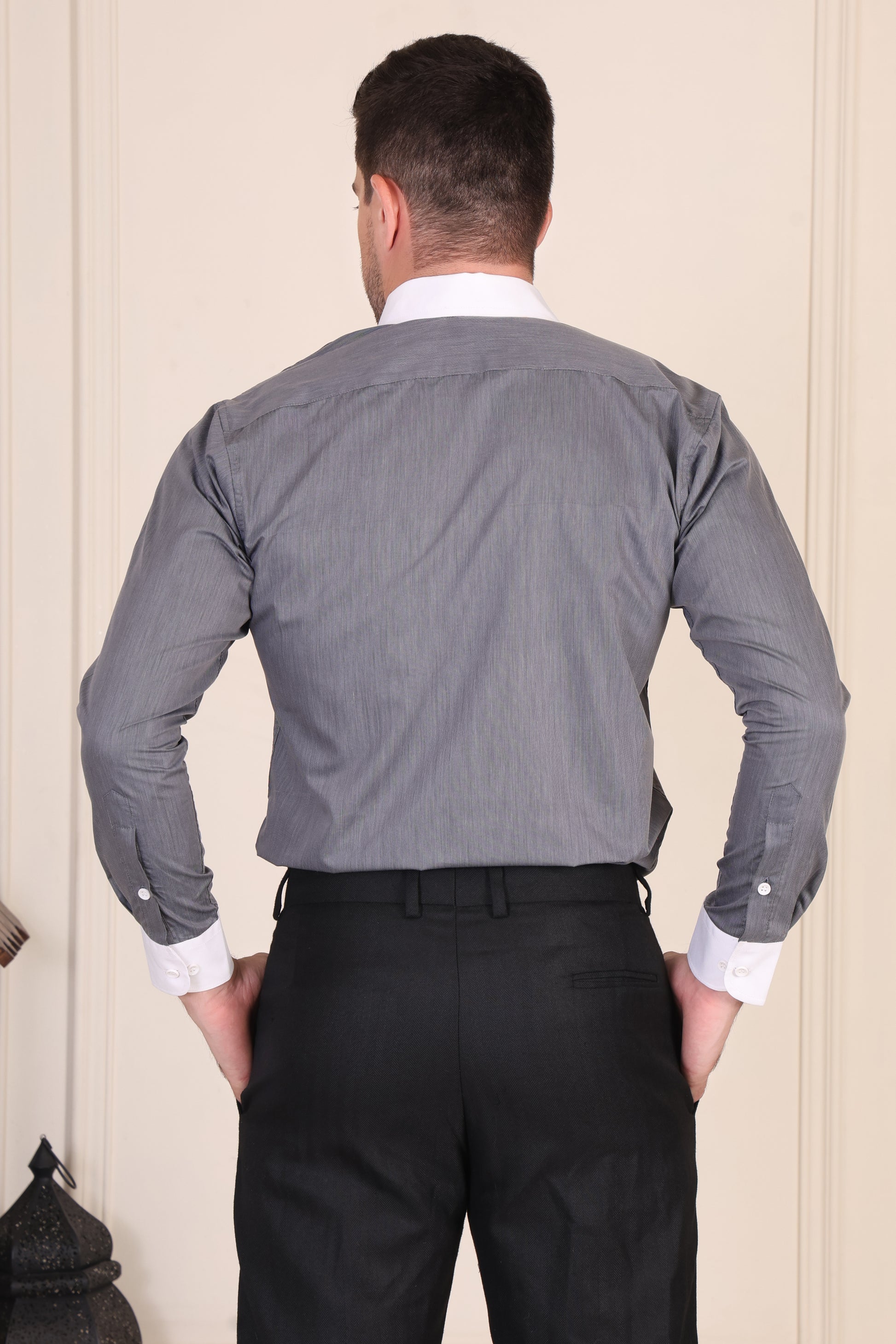 Crafted from a premium cotton-viscose blend, the fabric offers excellent breathability, a smooth finish, and a structured drape for all-day comfort. The micro pinstripe pattern in grey exudes understated elegance, while the white contrast collar and cuffs add a refined European touch — perfect for formal events, business occasions, or elevated eveningwear.